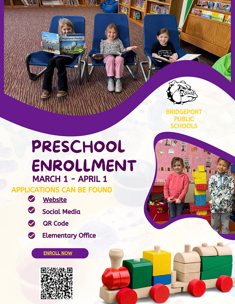 Bridgeport Preschool will be holding enrollment for the 2026-27 school year March 1-April 1, 2026. Please use the link below to complete the enrollment application.